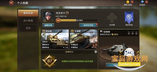 玩家可以在个人资料界面点击查看坦克群进入到坦克群展示场景界面,也可以在查看他人个人资料界面查看其他玩家坦克群。玩家不仅可以看看别人的坦克群是否比自己的坦克群霸气,还可以来推算对方的综合实力,判断约战的依据。同时,展示坦克群也能满足玩家们的成就感和优越感。