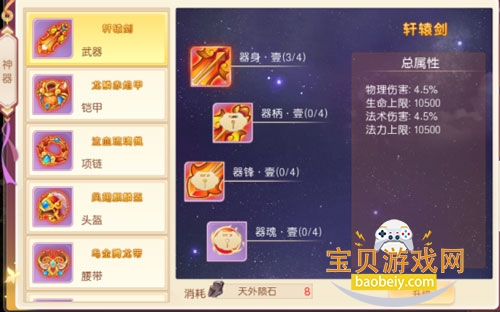 2.消耗同级别,同品质,但类别不同的法宝可获得下一级同品质的随机法宝(法宝可大幅度增加战力)