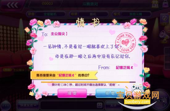 2、表白:首先需要持有“表白卡”,可在商城购买,购买后在游戏房间内,点击玩家,在右侧菜单中选择“向他表白”。被表白方选择“同意”或“拒绝”