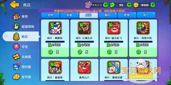 英雄皮肤可更改英雄的外观以及技能特效,所有皮肤都需要积累足够的同名皮肤碎片才能兑换。皮肤碎片可在商店内购买,售价为五钻石一个碎片,且永不下架。