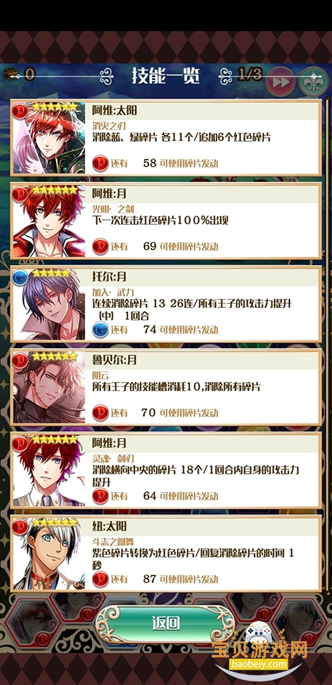 2、进入关卡后,如果记不得王子技能效果,可以先不要点击消消乐界面,先点击右上角技能一览,就可以清楚地看到每一个王子的技能。