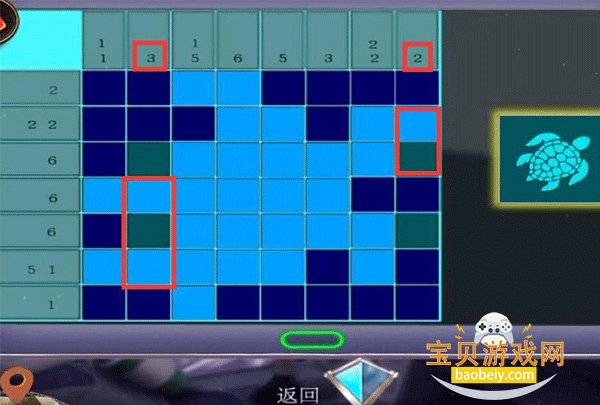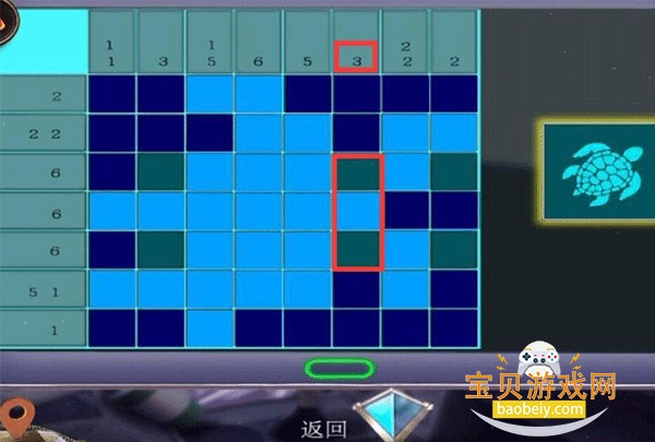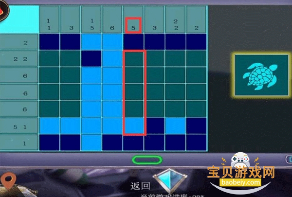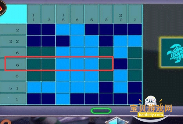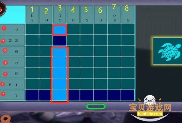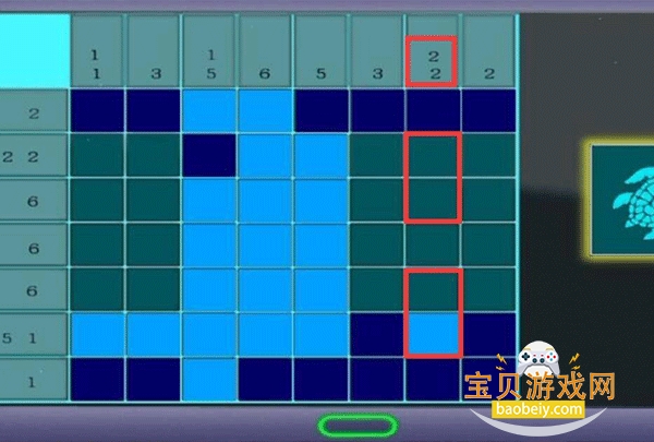 12、第二列数字为3,也就是连续亮起三块瓷砖,第四、六块瓷砖是固定亮起了的,所以只能选择点击第五块瓷砖。而第八列数字为2,连续两块瓷砖亮起,所以点击第八列第三块瓷砖即可。