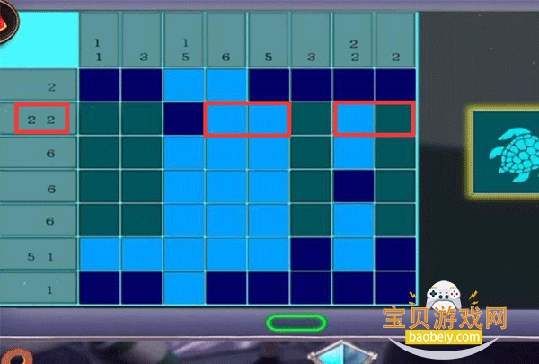 8、根据第七列数字22,而第一块不亮,第六块亮起,可以得到第七列的瓷砖是两个亮起隔一块再亮起来两个,也就是点击第二、三、五、六块瓷砖。