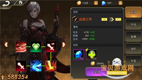 英雄突破将消耗大量突破石,后期还将额外消耗大量英雄碎片,但是提高的属性加成也是非常可观的。除了属性加成外,英雄突破还将解锁新的附加属性,例如血腥之雨第一次突破将解锁特殊技能:血骨剑,第二次突破解锁“生命值+1800”,第三次突破解锁“造成伤害+4%”……突破越到后期,解锁的属性也就越豪华。玩家可以在突破前先观察每个英雄的属性表,查看最合适的英雄进行突破哦。