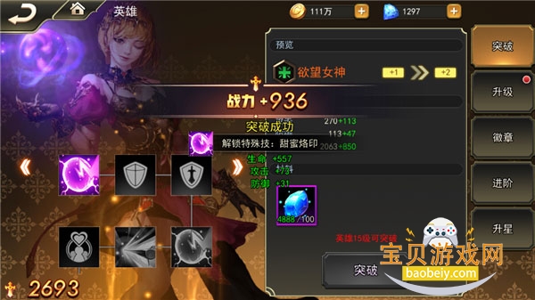 英雄突破:英雄突破是英雄提升战斗力的一个重要途径,通过英雄突破可以使英雄获得更多的能力,而紫色英雄突破满级10,紫色以上英雄突破满级为12级。英雄突破需要消耗突破石、金币和大量英雄碎片,而随着消耗物品的越来越多,突破所带来的属性加成也是呈阶梯状上升。