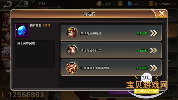 英雄突破消耗的突破石可以在英雄商店购买,在任意普通关卡都有概率掉落。而英雄碎片则可以通过商店购买、关卡掉落、万能碎片兑换获得。在游戏的中后期,突破材料的消耗非常巨大,前期积攒材料将很大程度决定后期突破的水平。