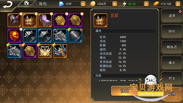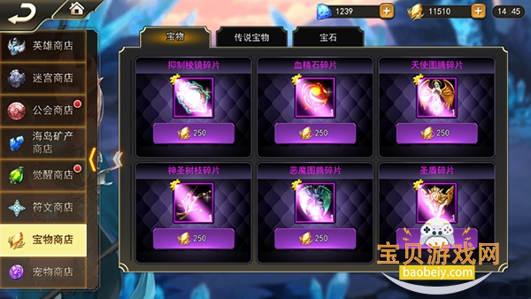 宝物目前分三种品质,蓝色,紫色 以及橙色,蓝色每5个碎片合成一个宝物, 紫色需要20个碎片合成,橙色则需要50个碎片合成。一般来说,初期可以换几个蓝色的过度一下,主要还是换取紫色宝物(遇到活动最好能换成橙色的哦),换取宝物之前我们要看一下每个英雄需要哪些宝物,不然辛辛苦苦换了一个不匹配的宝物就尴尬了。橙色的宝物获取难度比较大,要通关到指定的副本关卡才可以解锁,所以我们前中期主要精力还是放在兑换紫色宝物上,这样能快速的提升自身的实力从而更容易的去通关后面的关卡。