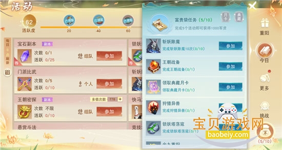 点开活动界面右下角的军资图标,可查看当天的富贵袋任务。每天只需完成10个活动,即可免费获得1000军资(小月卡翻倍)。