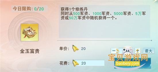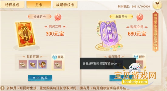 最后推荐两种氪金获取军资的方法:购买大小月卡和金玉富贵。大月卡每天可领2000军资,富贵袋任务可额外领取2000军资。小月卡每天可领1000军资,富贵袋任务可额外多领1000军资。