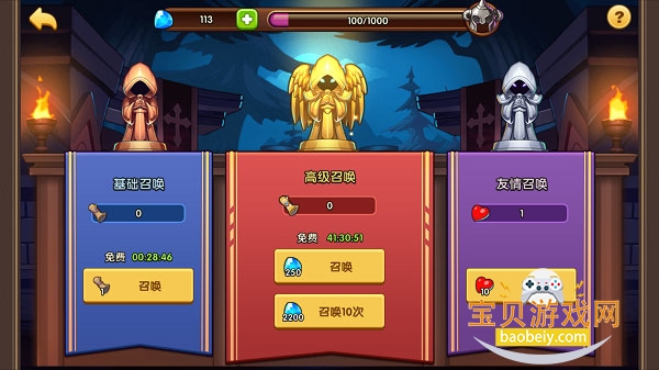 召唤法阵:在这里你可以消耗钻石或者使用召唤卷轴,就有机会获得强大的英雄,相信你的运气,成为欧皇不再是梦想。