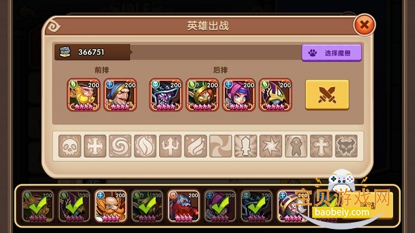 除了挂机外,在咱们的游戏中还有体验到各种各样的战斗。在进行战斗前,最重要的一步就是设置战斗的阵容了。我们可以选择想要派出的英雄,然后点击它的头像上阵,还可以拖动英雄的头像来变换英雄的站位。然后在选择魔兽那里选择想要出场的魔兽,我们的队伍阵容就设置完毕了。