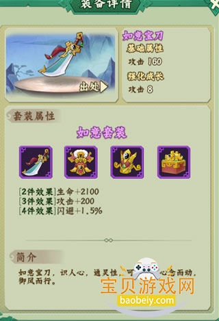 游戏内的紫色装备主要分为降妖套装和如意套装,分别对应游戏内的输出类角色和坦克类角色的装备,输出类角色推荐使用降妖套装,坦克类角色推荐使用如意套装,如意宝刀作为所有坦克类葫芦娃的缘分武器(小金刚除外),多使用并且强化可以更好地强化自身属性以及战力,降妖套装主要提升的则是输出,推荐给后排葫芦娃使用。