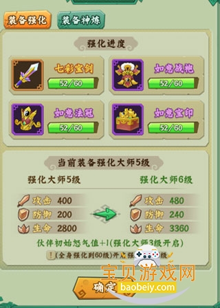 装备可以通过强化来提升装备的属性,强化需要消耗银币,强化的最高等级为游戏角色当前等级的2倍,比如你是20级,最高就能把装备强化到40级,除了强化系统以外,强化还有一个强化大师功能,全身装备每10级可以提升1级强化大师等级,强化大师等级会额外提升属性比如全部装备达到50级,强化大师的等级也就是5级,强化大师可以提升攻击,防御和生命属性,建议对于强化等级进行平均性的提升,这样的收益更大。
