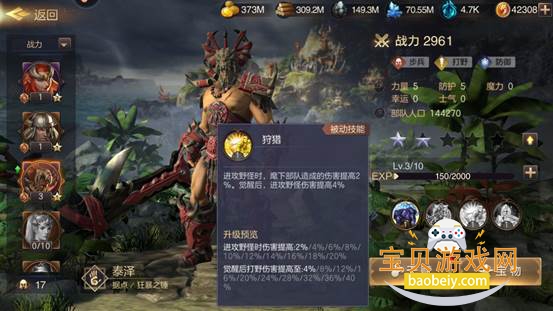 打野技能是狩猎,满星觉醒后伤害提升为百分之四十,中规中矩的一个技能,提升打野伤害,主被动技能是步兵加成技能(满星技能加成:步兵生命提高百分之二十,步兵伤害提升百分之二十),相对来说实用性不大,因为步兵打野的移动速度比较慢,打野效率不高,但是对于新手来说这个英雄的获取难度是非常低的,因此如果可以提升到高星级的话,还是很推荐泰泽的。(仅从打野方面来讲)