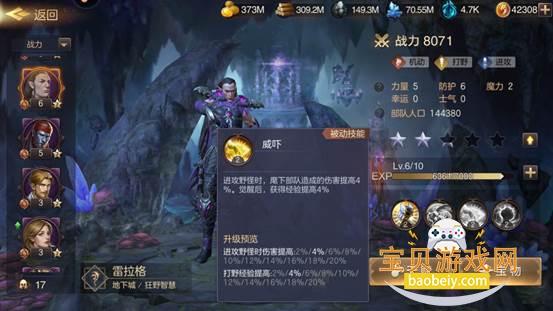 打野技能是威吓,满星觉醒的技能效果是打野时伤害提升百分之二十,打野经验提高百分之二十,打野经验提升百分之二十,相当于打五次的效果是别人打六次的效果,非常实用,另外一个技能机动部队是机动兵种的加成技能(满星觉醒效果:机动部队伤害提高百分之二十,机动部队生命提高百分之二十),对于机动兵种这个打野兵种来说很实用,雷拉格相对于这个机动兵强势的新版本,原本打野就强势,升级也有优势,作为紫色英雄,升星,突破难度都不高。