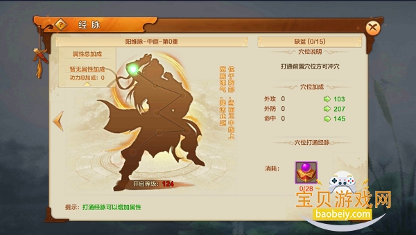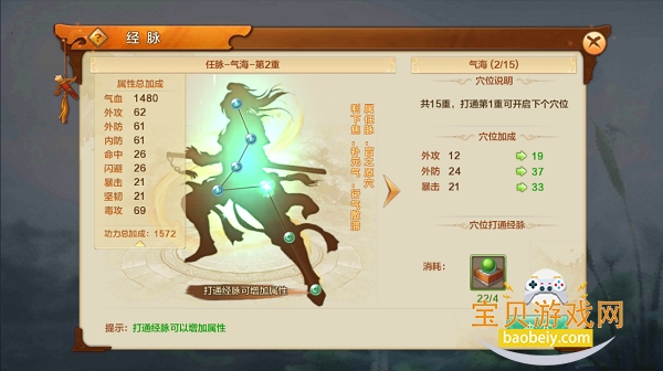 每一套经脉都有15重,需要打通第一重才能开启下个穴位。也正因为如此,在提升的时候就需要一定的计算了。