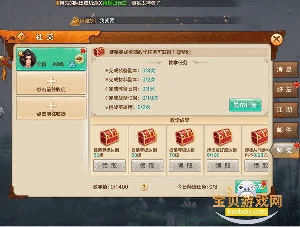 教学任务每日随机刷新,每个徒弟每日可发布一次;