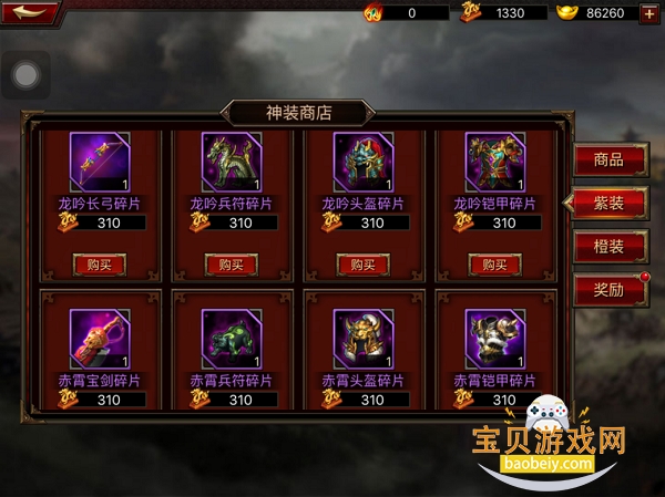3、紫色装备碎片获取途径为主线副本以及三国无双中的神装商店。