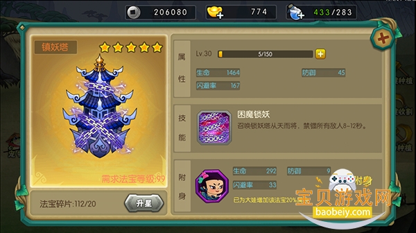 镇妖塔为大娃专属法宝,可以提升自身属性外还有特殊技能禁锢所有敌人
