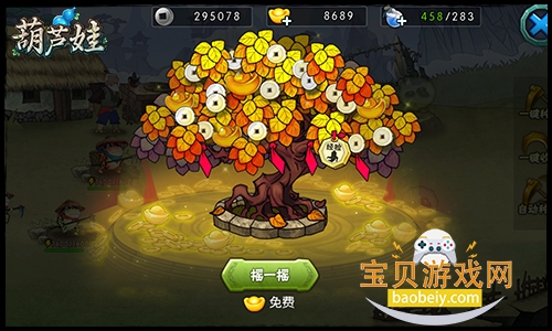 在《葫芦娃》的世界之中,有一颗山神赐给葫芦娃们的神树名叫“摇钱树”,在付出少量元宝的基础上,玩家们在《葫芦娃》中可以利用摇钱树获取丰厚的银币,为葫芦娃们购买装备碎片以便升阶。每日前几次摇钱树的性价比还是很高的,并且10倍暴击银币的几率也是非常可观,玩家们一定要珍惜机会啦!摇钱树银币掉落的“哗啦啦”声是不是很好听呢?