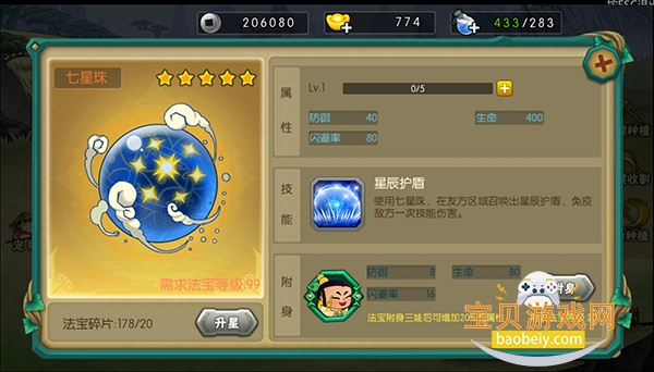 七星珠为三娃专属法宝,可以提神自身属性外还有特殊技能免疫敌方一次技能伤害