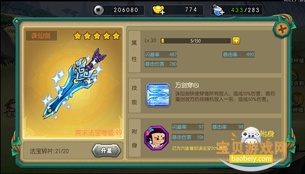 诛仙剑为六娃专属法宝,可以提神自身属性外还有特殊技能对所有敌人早晨伤害