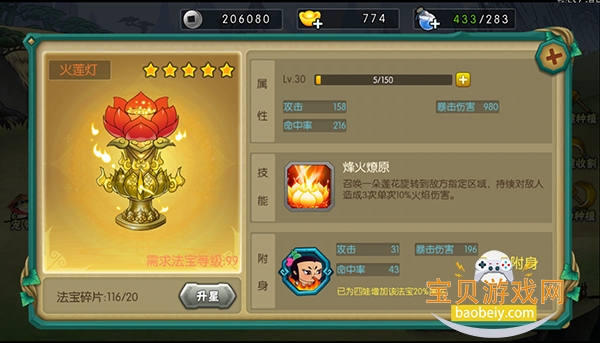 火莲灯为四娃专属法宝,可以提神自身属性外还有特殊技能队敌造成三次火焰伤害