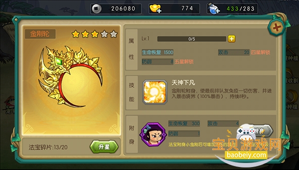 金刚轮为小金刚专属法宝,可以提神自身属性外还有特殊技能友方前排免疫伤害且增加暴击