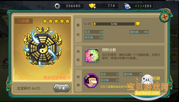 八卦镜为二娃专属法宝,可以提升自身属性外还有特殊技能增加自身能量和降低敌方能量