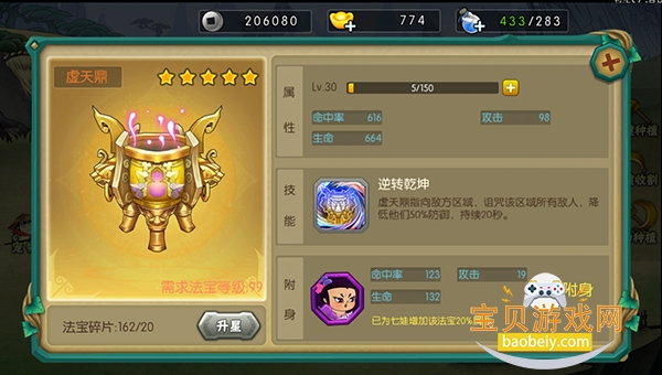 虚天鼎为七娃娃专属法宝,可以提神自身属性外还有特殊技能诅咒敌人降低50%防御