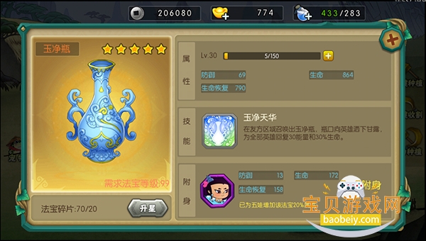 玉净瓶为五娃专属法宝,可以提神自身属性外还有特殊技能提升团队能量和回复血量