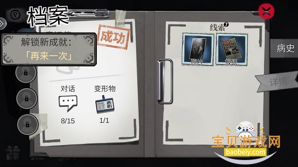 2、线索收集玩法:全面搜查场景细节,翻开病历夹、拉动衣柜寻找暗格、用相机拍摄“不合理”物品留存线索,将破碎日记、录音笔内容整合,推导病情诱因与密码信息。