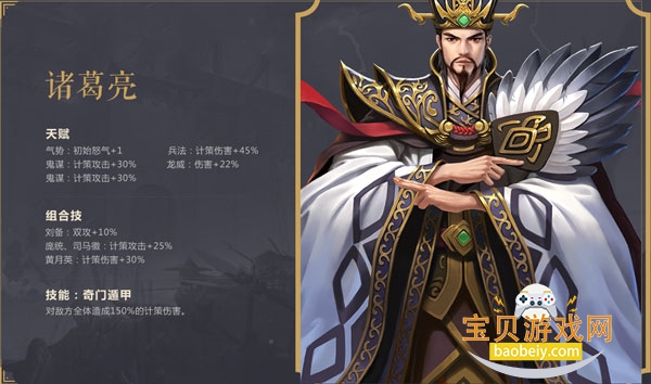 3、技能·奇门遁甲:对敌方全体造成150%的计策伤害。