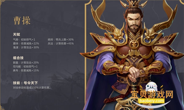 1、天赋·气势:初始怒气+1;天赋·兵法:计策伤害+45%;天赋·鬼谋:计策攻击+30%;天赋·龙威:伤害+22%;天赋·鬼谋:计策攻击+30%。