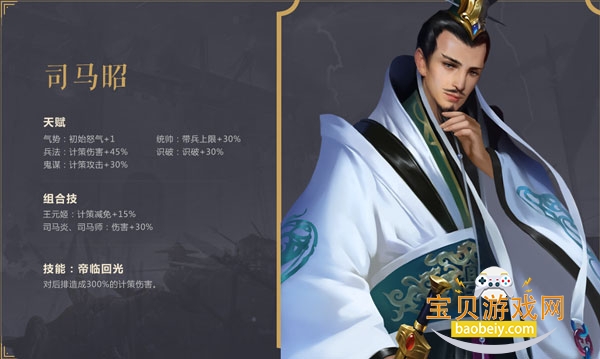 2、组合技·王元姬:计策减免+15%;组合技·司马炎、司马师:伤害+30%。