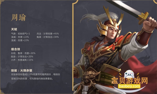 3、技能·火烧赤壁:对全体目标造成110%伤害并灼烧两回合,每回合受到20%的伤害,可与其他灼烧效果叠加。