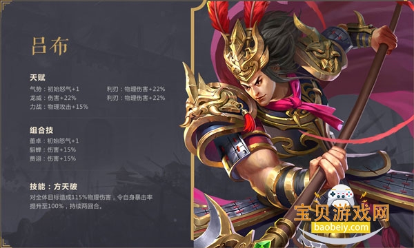 3、技能·方天破:对全体目标造成115%物理伤害,令自身暴击率提升至100%,持续两回合。