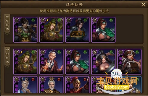每个橙色武将可以带两个副将,紫色武将可以带一个副将。副将质量必须低于主将。副将的属性将会加成到主将身上,具体如下图。使用系统推荐的副将,将会获得更多属性加成。