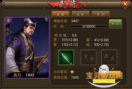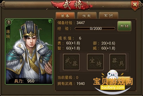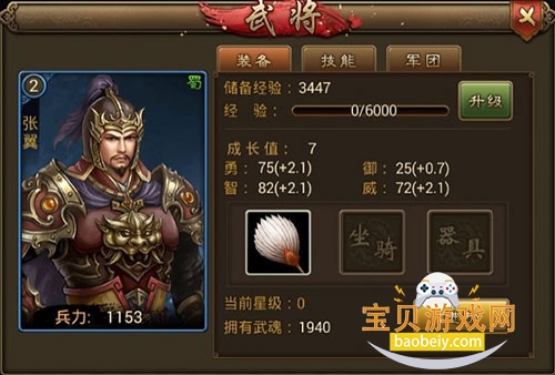 武将的装备栏,可以看到武将的最基础属性,有经验和储备经验,当前经验就是武将升级所需要的的数量.