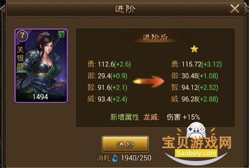武将星级,初始值为0星,消耗武魂值,可提升武将的星级即进阶,每级所需武魂值逐步提升,每进阶一次,武将属性获得加成,成功进阶后,可获得额外随机新增属性。
