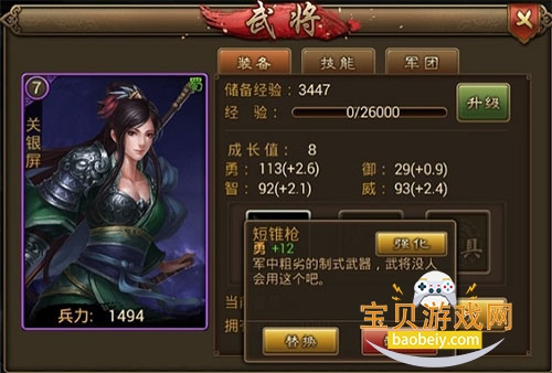 武将装备可以进行替换,卸下,以及强化的操作。强化需要消耗1个同样的装备方可进行