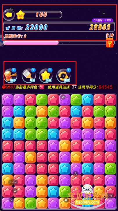 2、开始消灭星星,需要达到目标才可过关。必要时可以使用道具帮助消灭星星。