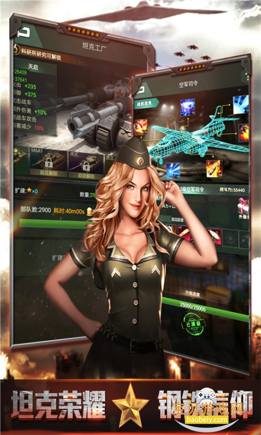 基地建设系统:可建造升级仓库、工厂、科研所等设施,提升资源产能与科技研发速度;支持模块化布置防空炮台、反坦克壕沟等城防工事,构建立体防御体系,抵御敌方突袭。