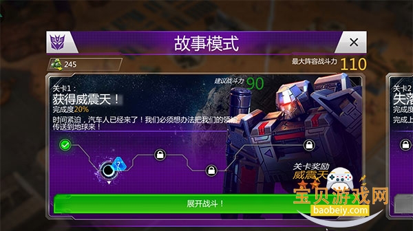 7、整款游戏会随着故事模式展开整个剧情。在每开始一个任务剧情时,玩家都可以看到此剧情通关所需的大致战斗力。