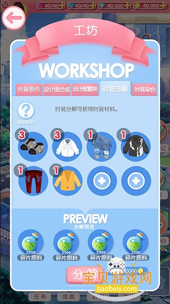 (2)时装分解:多余的时装可以进行分解,获得时装材料。