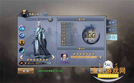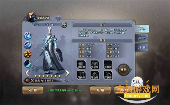 玩家在副本中可获得大量侠客装备,在侠客界面中可将装备穿戴在侠客身上,每当侠客穿齐一套装备后,可以对侠客进行升阶。升阶后的侠客属性加成更为强大。侠客培养需要用到资质丹,资质丹可以在日常副本和抽奖中获得。服用了资质丹之后的侠客,自身属性将得到大幅度提升