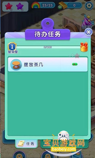 2、下面开始修复奶茶店,先摆放些新茶几,点击任务,开始重建集市,摆放茶几需要消耗1颗红星