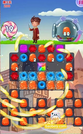 6、把4颗糖果连在一起会形成强力的魔法特效,启动它会消除直线上的所有糖果