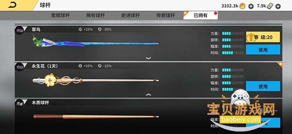 2、B级球杆现阶段只有玩家的初始球杆(初始球杆不能升级)