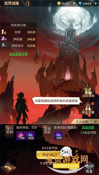 3、无尽试炼:主要获取灵力、符文精华,符文精华用于符文商店购买符文,若进行通关战力不足情况下可雇佣好友英雄战力比较高合适自己阵容的英雄进行支援完成(不可选择超过拥有英雄120%战力的支援英雄),每5层有首通奖励,伤害排名根据玩家打出的伤害进行排名,伤害越高,排名越靠前,奖励越丰富,也会展示给所有玩家看~